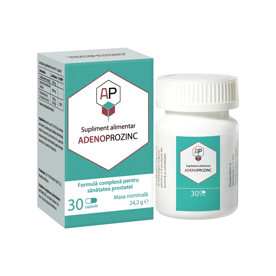 ADENOPROZINC este o formulă originală cu acțiune complexă pentru sănătatea prostatei și a sistemului urinar la bărbați. Adenoprozinc este recomandat în: afecțiuni ale prostatei și a segmentului inferior al sistemului urinar; urinări frecvente, în special a celor nocturne; optimizarea funcțiilor sexuale; prevenirea afecțiunilor de prostată; suplimentarea cu zinc a țesutului prostatic.