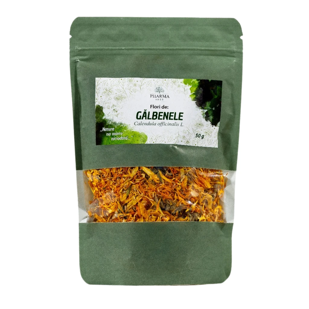 Florile de gălbenele conțin flavonoide, carotenoide, vitaminile A, C și K, saponozoidele triterpenice și acizi organici. Infuzia obținută din flori de gălbenele posedă acțiune antiinflamatoare și capilarotonizantă, crește funcția metabolică a ficatului, ameliorează conținutul bilei și reduce concentrația bilirubinei și a colesterolului. Stimulează funcția secretorie și excretorie a TGI.