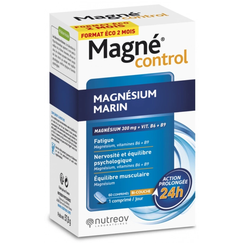 Nutreov Magné Control 60 comprimate este un supliment alimentar sub formă de comprimate cu două straturi, care conține magneziu marin și vitaminele B6 și B9.