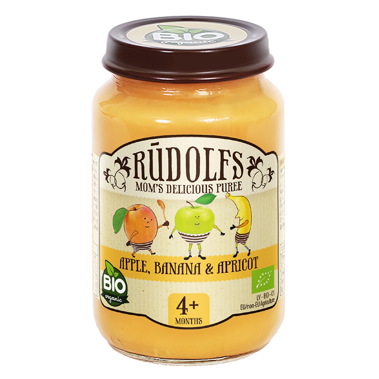 Rudolfs Organic Piure Mere, banane, caise 190g (4+)