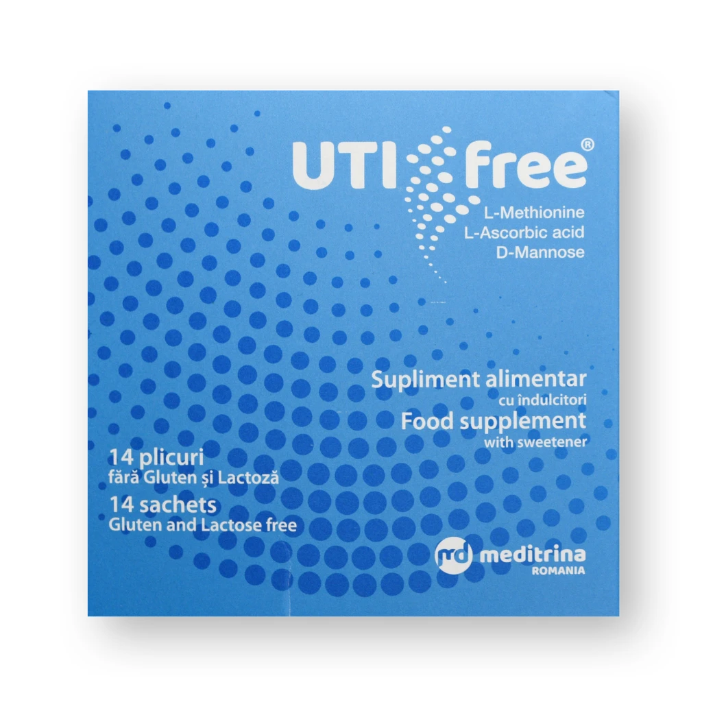 UTI Free plicuri este un supliment alimentar, fără gluten și lactoză, cu un gust plăcut de biscuiți, destinat abordării terapeutice de la nivelul tractului urinar inferior. UTI Free plicuri conține concentrația potrivită de L-metionină care determină acidificarea rapidă a urinei. L-metionina în combinație cu Vitamina C, are efect sinergic. UTI Free conține D-manoză în concentrația și în doza, recomandată de ultimele studii pentru abordarea terapeutică de la nivelul tractului urinar inferior. În plus, UTI Free conține sucraloză ca îndulcitor și astfel crește complianța consumatorilor datorită gustului plăcut de biscuiți și oferă totodată flexibilitate pentru a fi utilizat de către pacienții diabetici.